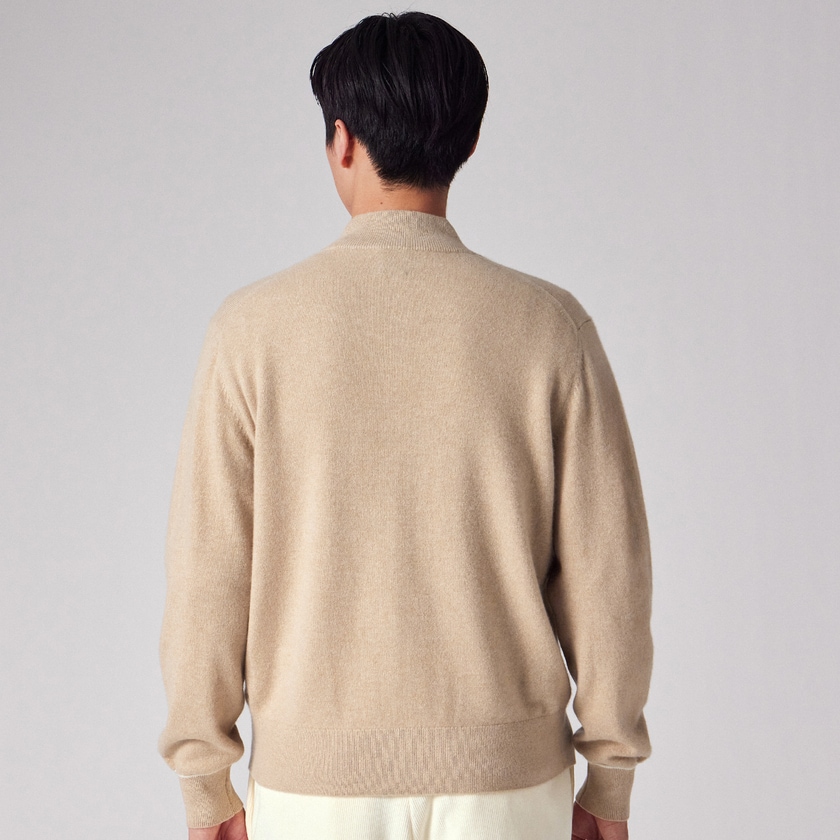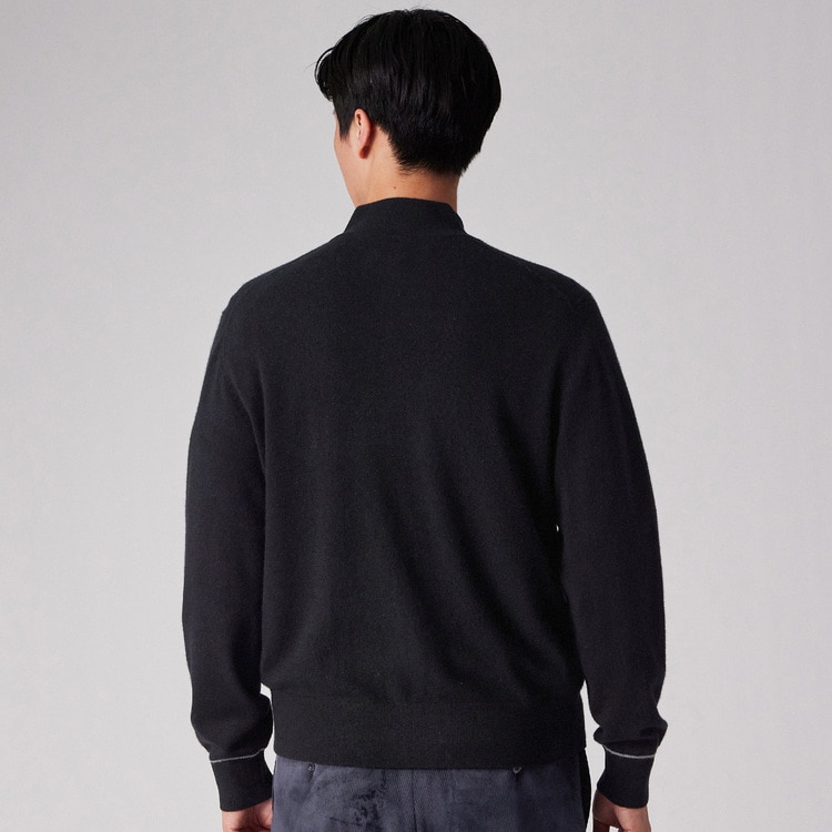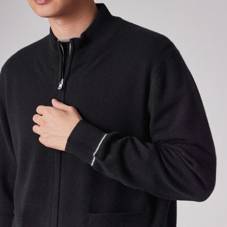 縮絨(しゅくじゅう)加工を施して編み目の密度(度目)を極限まで詰めることで、風を通しにくく、しっかりとした肉感(厚み)を持たせています。これにより、ニット特有の型崩れを防ぐとともに、カシミヤの高い保温性を逃しません。フロントにはポケットも備えており、実用性と防寒性を高いレベルで兼ね備えています。