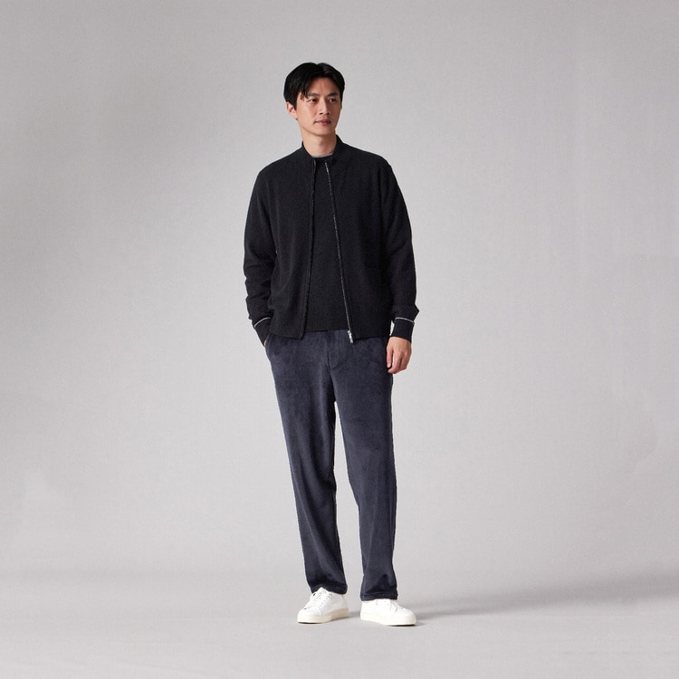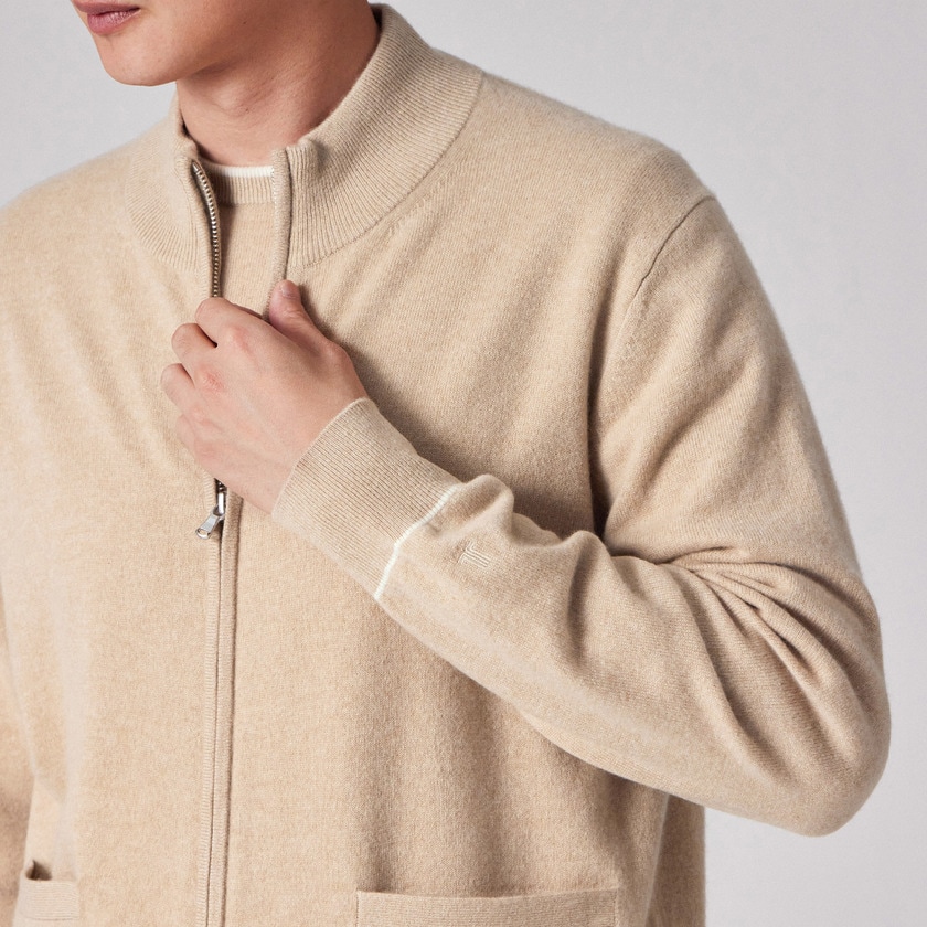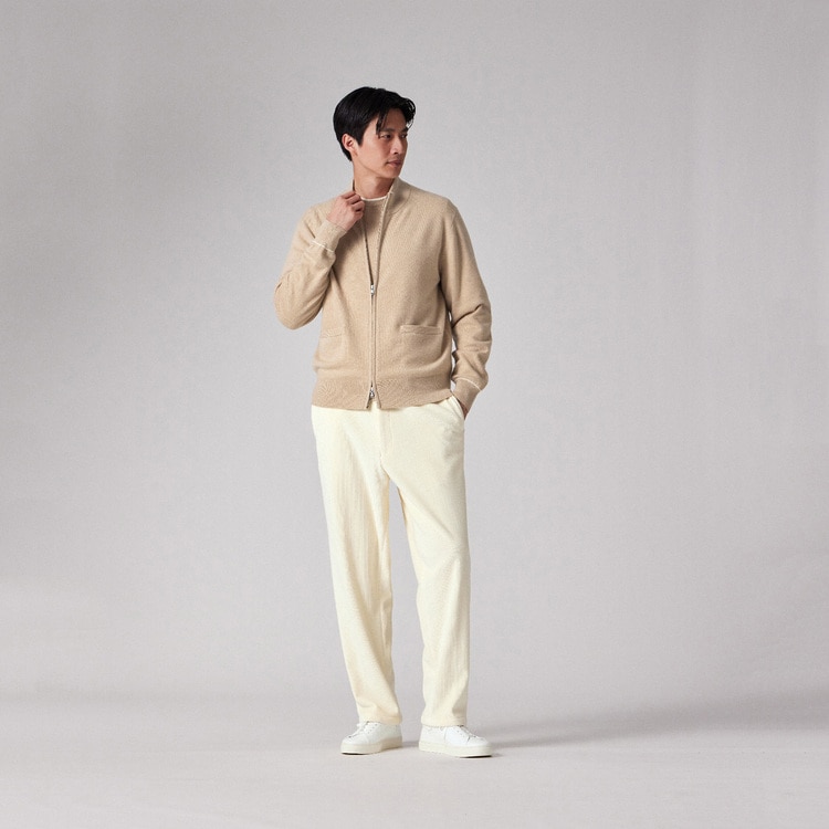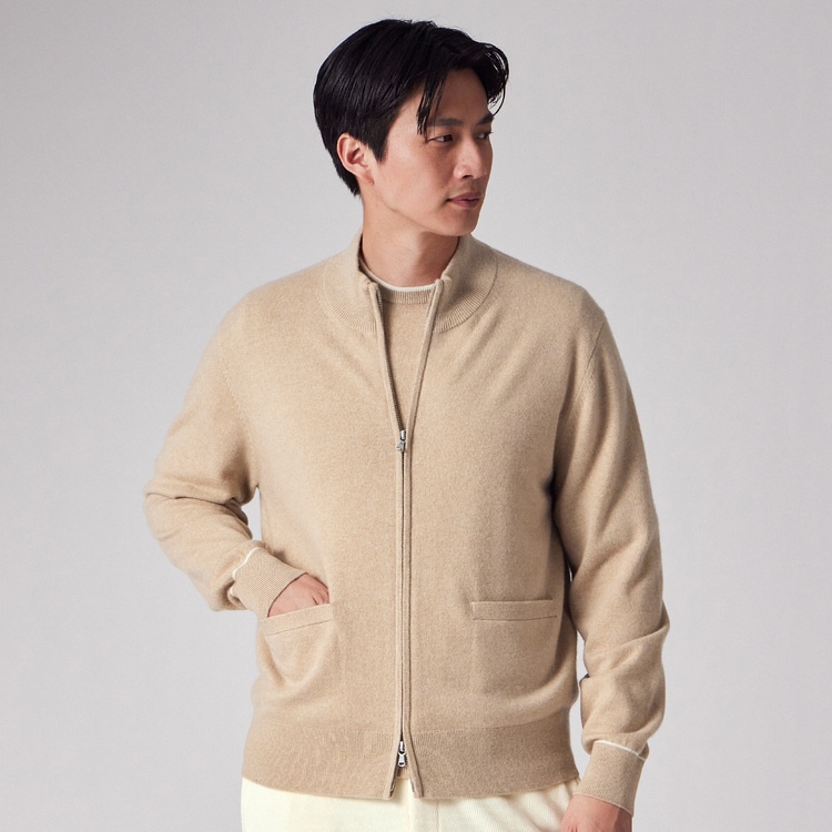 一般的なカーディガンよりも厚みとハリがあるため、秋口や春先にはTシャツやシャツの上に羽織る「軽いアウター(ニットブルゾン)」として活躍します。寒さが深まる真冬には、コートやダウンジャケットのインナーとしても着用可能。気候に合わせてアウターにもインナーにもなる、非常に汎用性の高い一着です。