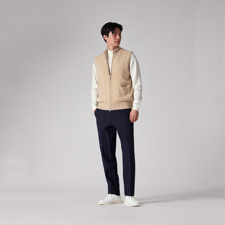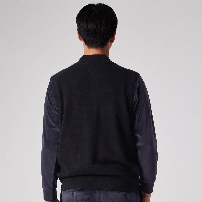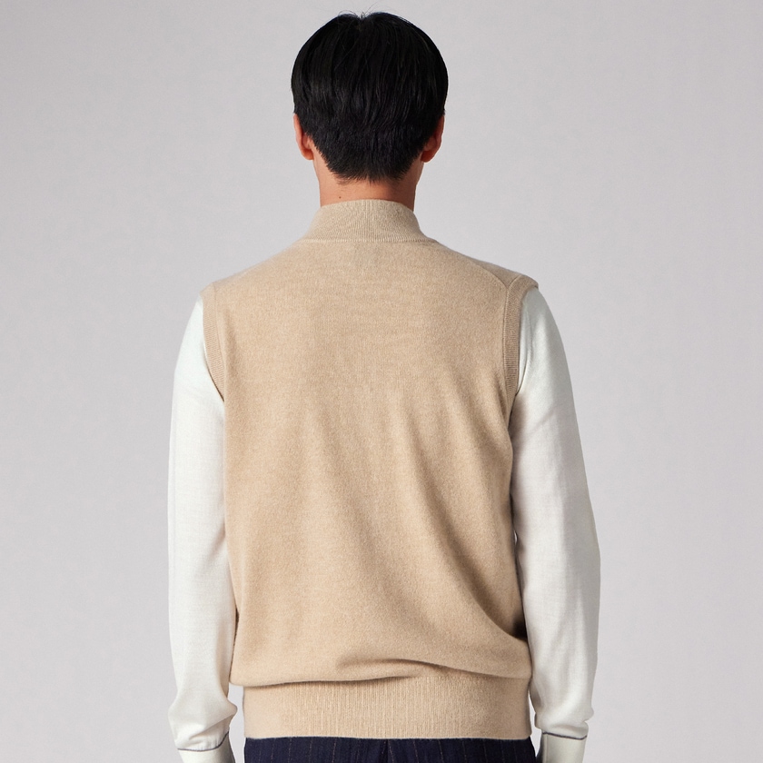 縮絨(しゅくじゅう)加工によって編み目の密度を詰めているため、風を通しにくく高い保温性を発揮します。袖のないベストタイプは、腕周りの可動域を妨げず、ジャケットや厚手のアウターの中に着込んでも着膨れやもたつきがありません。フロントジップの開閉により、屋内外での細かな体温調節もスムーズです。