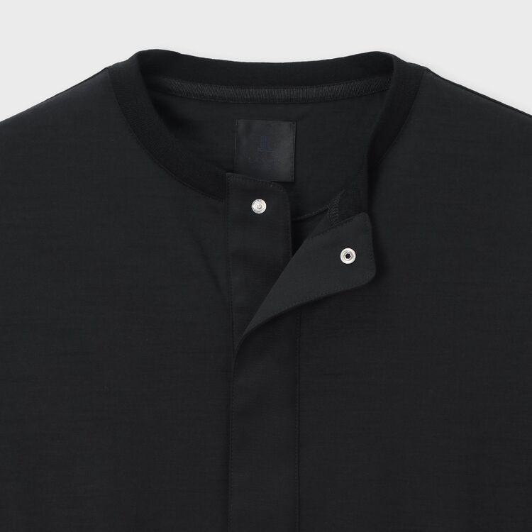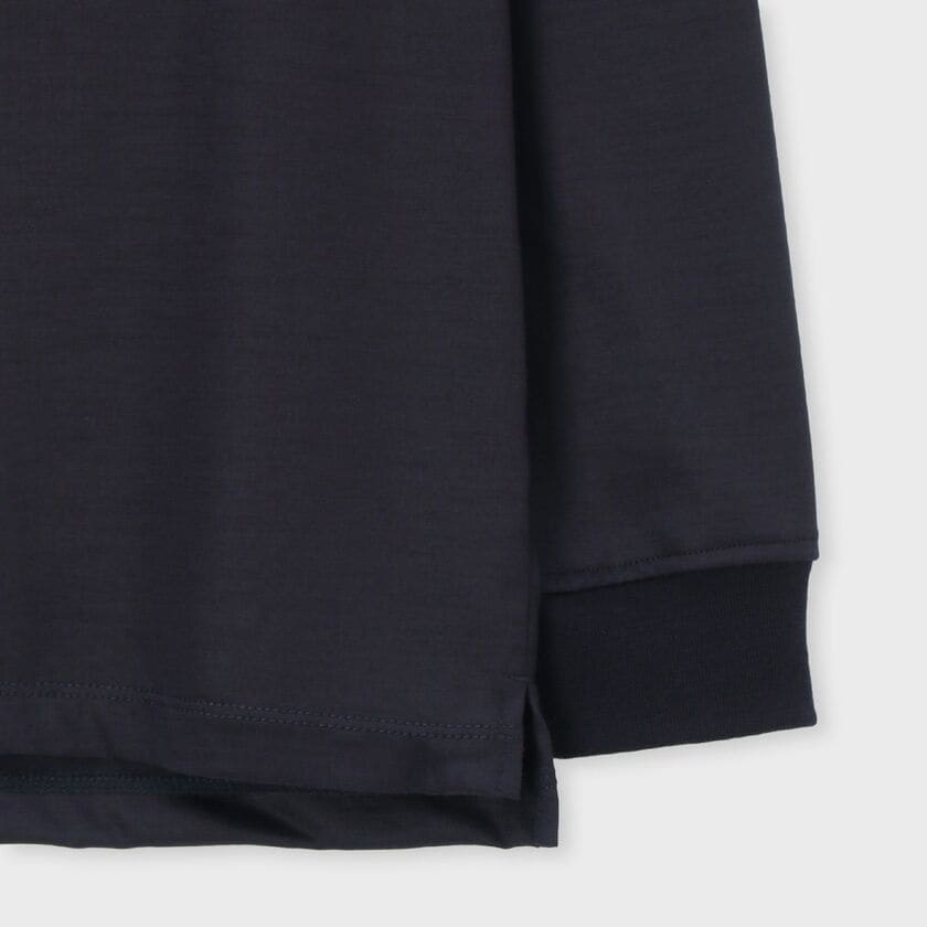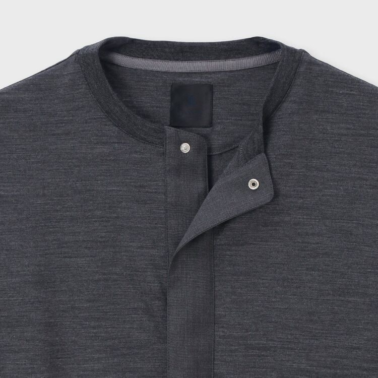 深めに設定されたフロントの前立てが特徴的なモデル【SAINTE/サント】です。前立て部分にはボディと同色の別布ウール生地を使用することで、カジュアルなヘンリーネックを高級感のある佇まいに昇華させました。留め具には隠しドットボタンを採用し、ミニマルに見せつつも、開けた時に覗くメタルの質感がさりげないアクセントに。前立て下部にはブランドの証である「WJL」の刺繍が施されています。