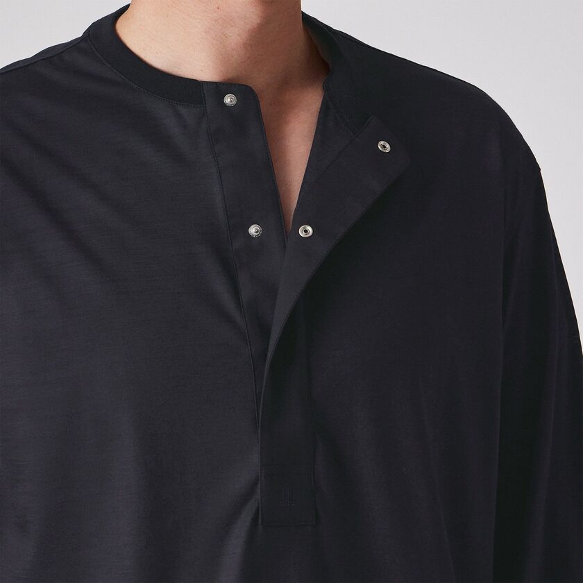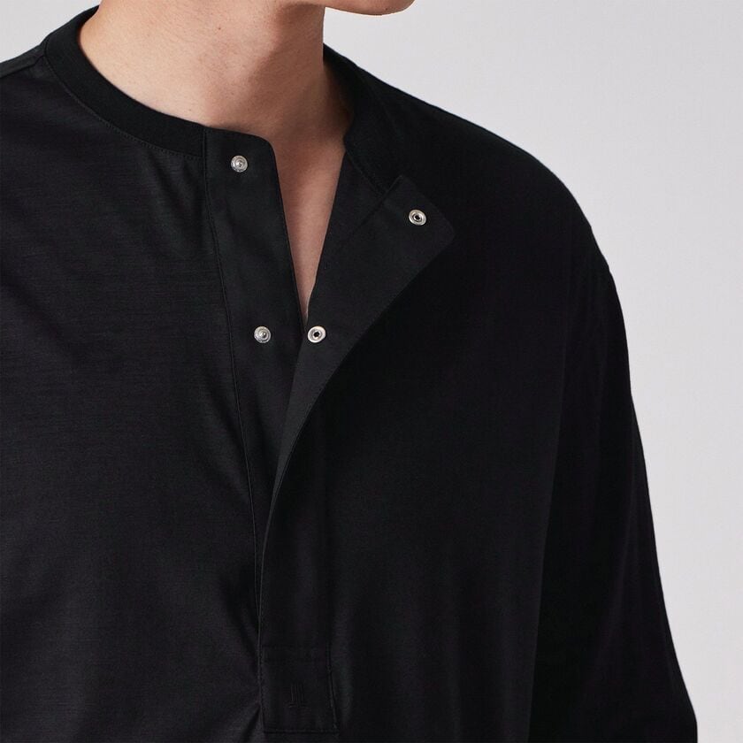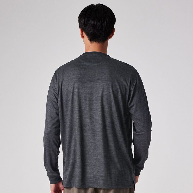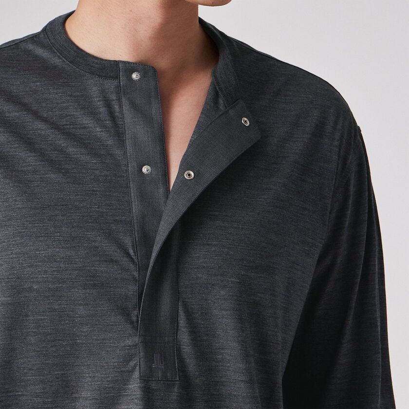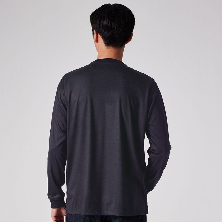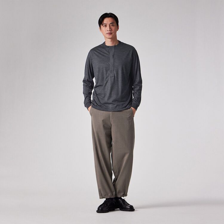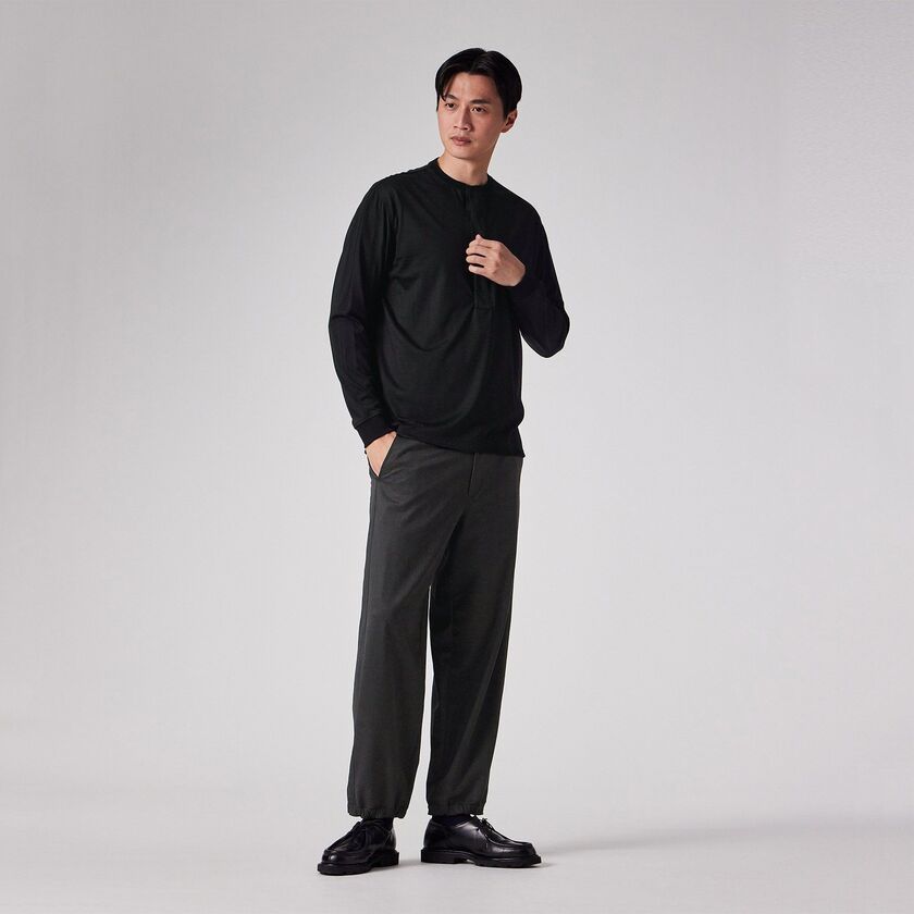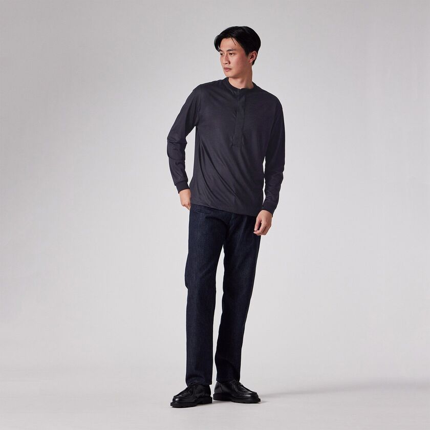 Tシャツ感覚で着られる快適さがありながら、見た目は非常にドレッシーなため、ジャケットのインナーとして合わせることで洗練された大人のビジネスカジュアルスタイルが完成します。また、デザイン性の高い深めのヘンリーネックは、一枚で着ても首元にニュアンスが生まれ、上質な休日着として存在感を発揮します。