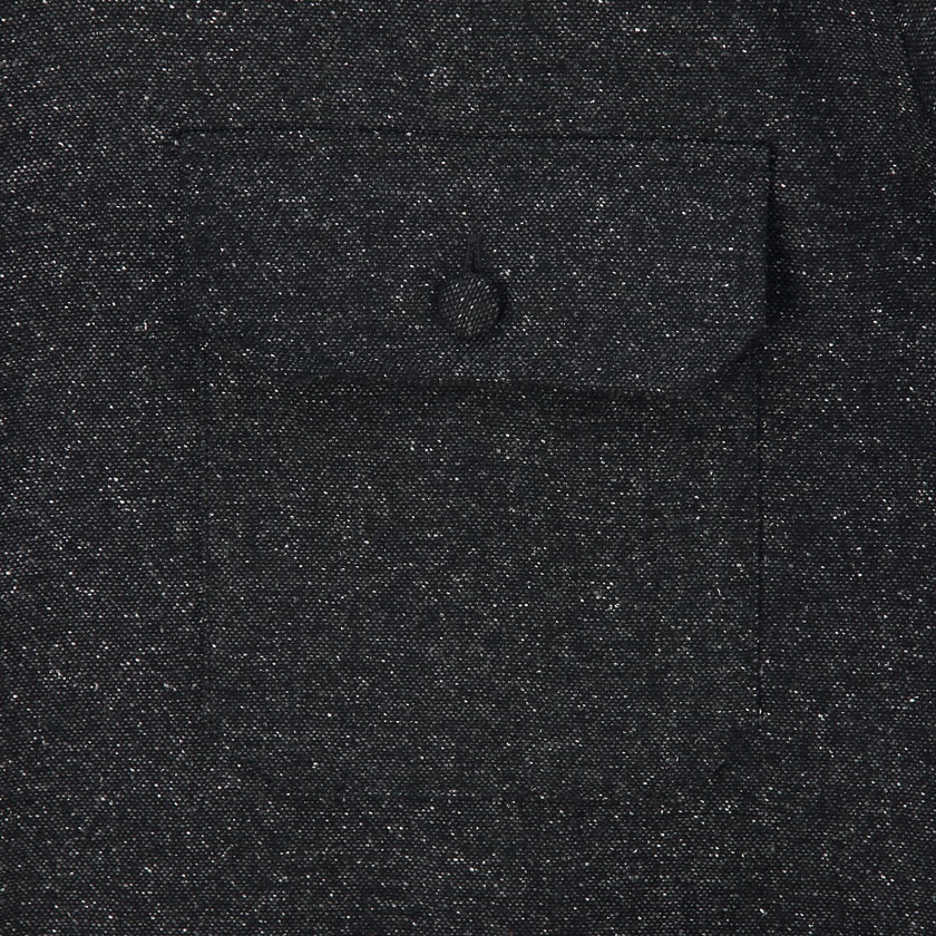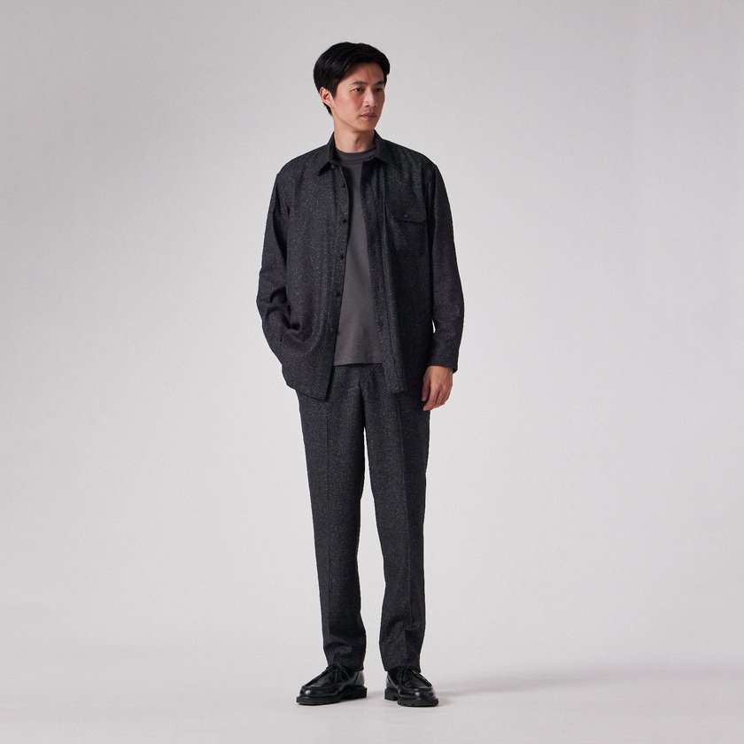 ウールとシルクをブレンドした、非常に贅沢な素材を使用しています。クラシックなソフトツイード調の織り組織でありながら、シルク特有の繊細な光沢感が加わることで、従来のツイードにはないラグジュアリー(LUX)な風合いに仕上がっています。温かみのある質感の中に艶やかさが漂う、クラス感のあるファブリックです。