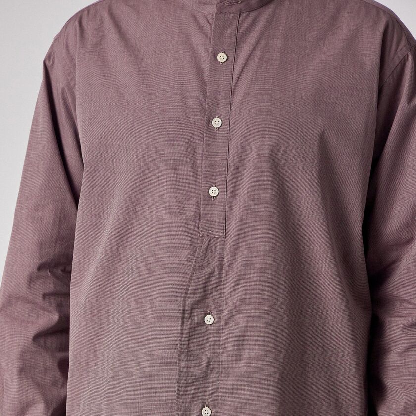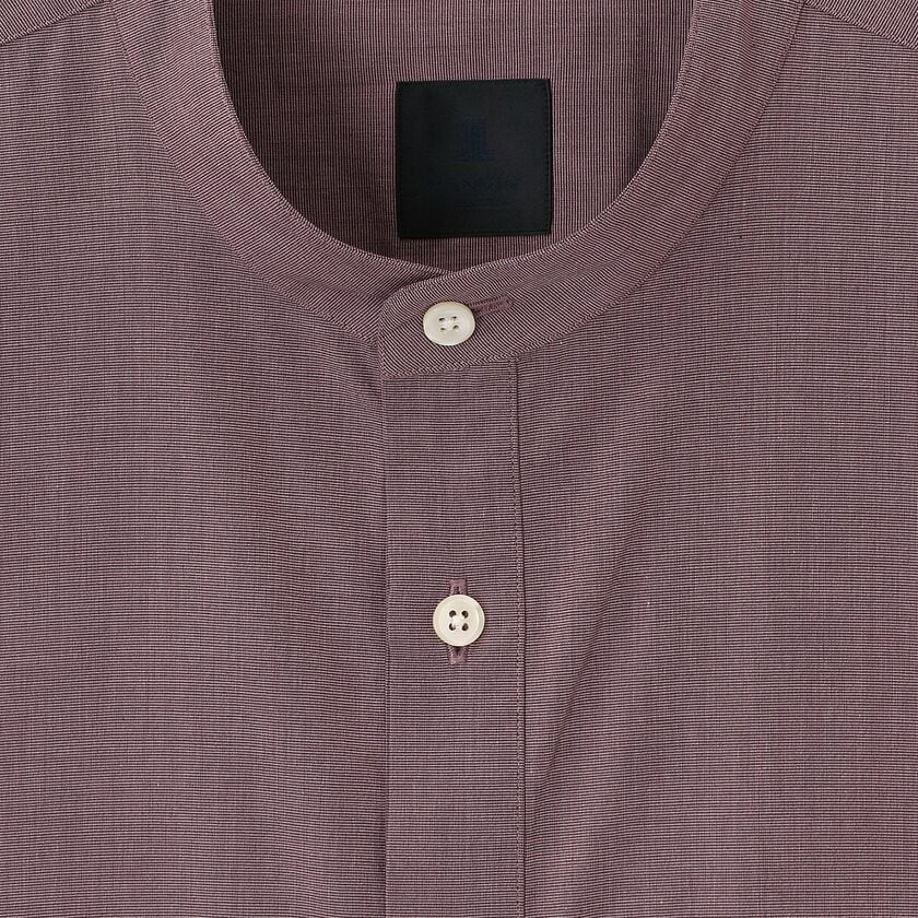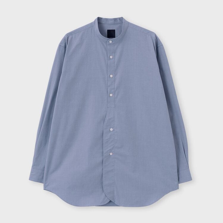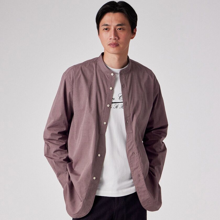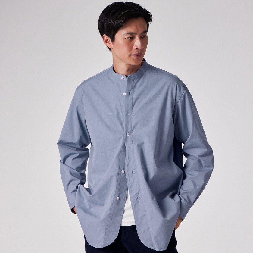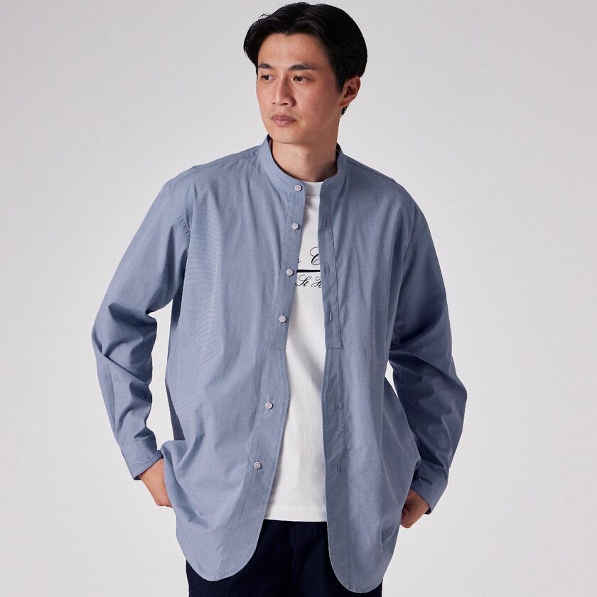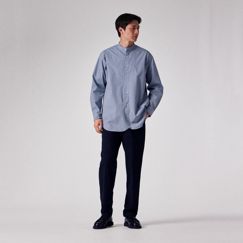 モデル【SAMBRE/サンブル】は、首元をすっきりと見せるバンドカラーシャツです。最大の特徴は、フロントの打ち合わせ部分(前立て)にクラシックなドレスシャツのディテールを踏襲したデザイン。伝統的な要素を取り入れつつ、現代的なシルエットに落とし込むことで、単なるインナーシャツに留まらない存在感を持たせています。