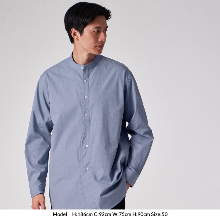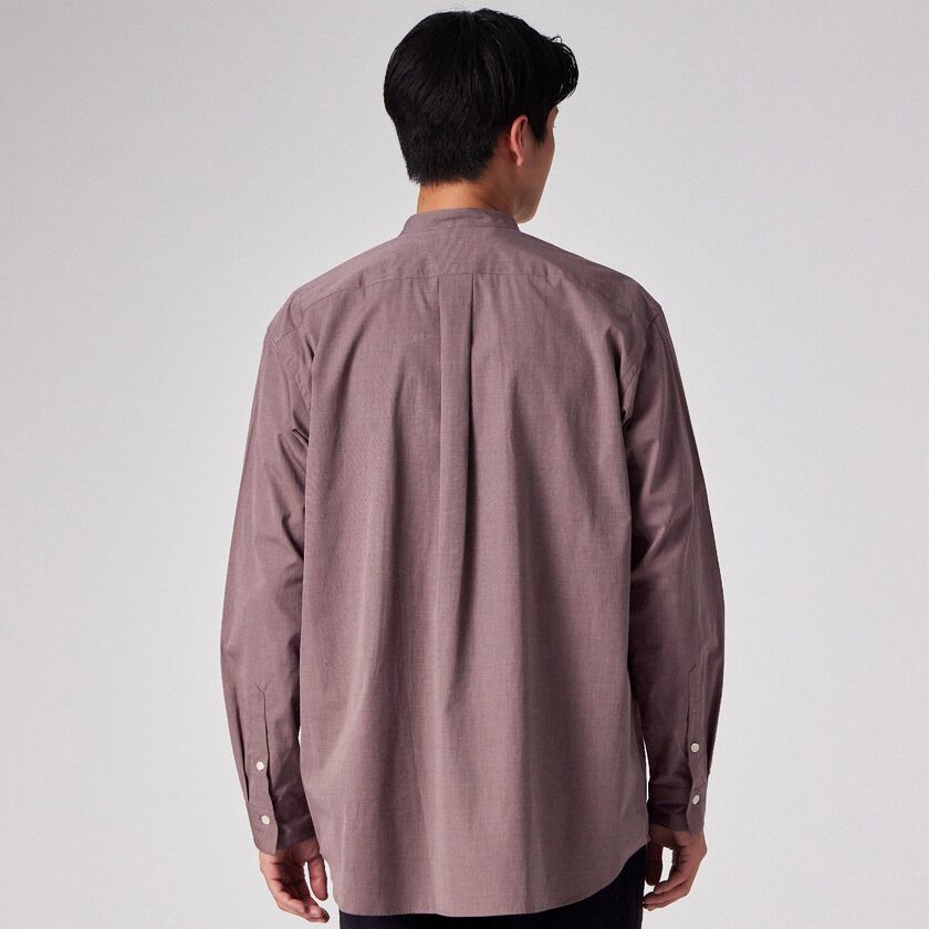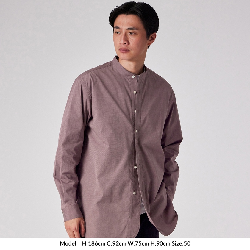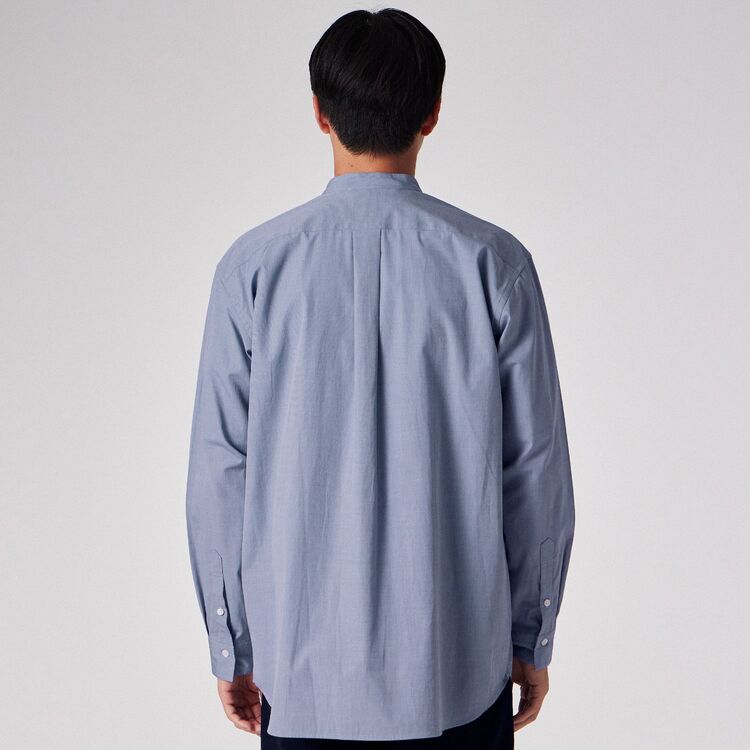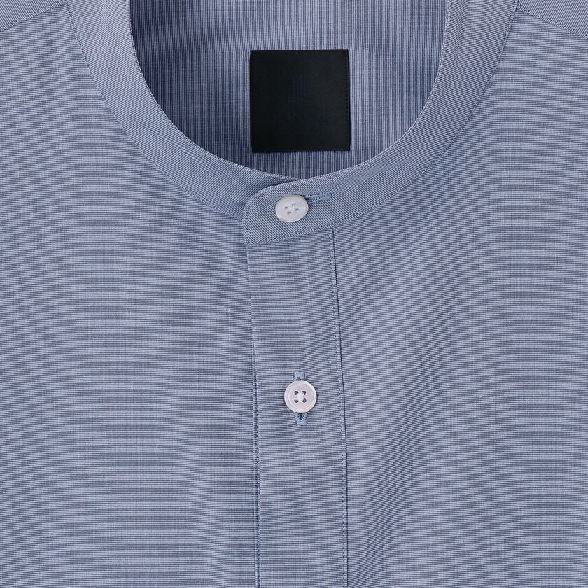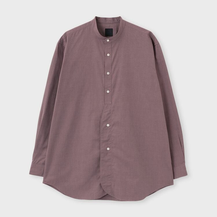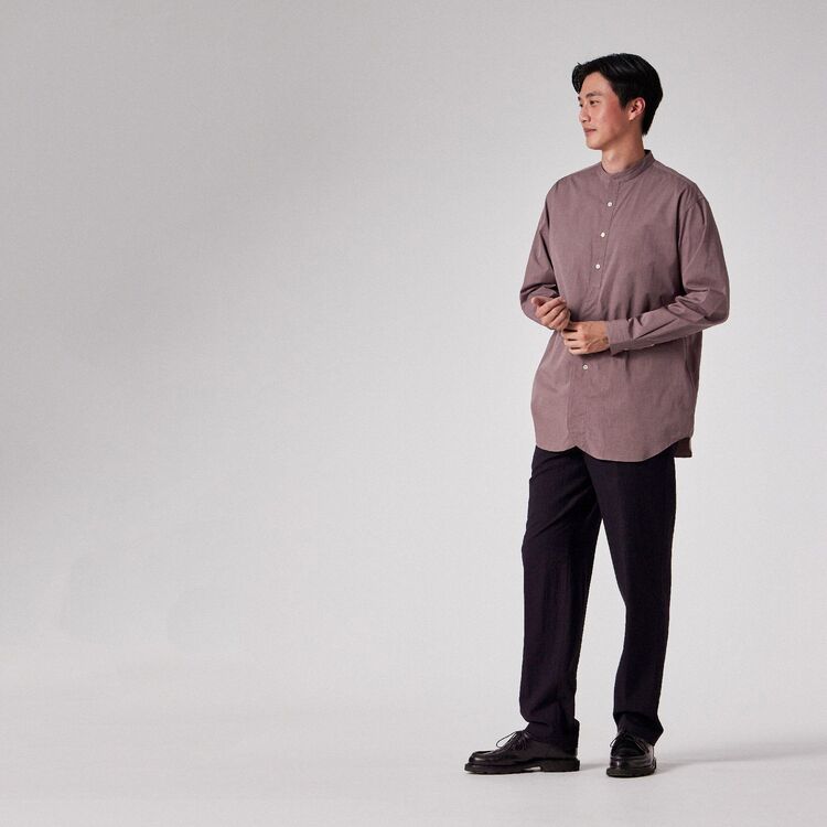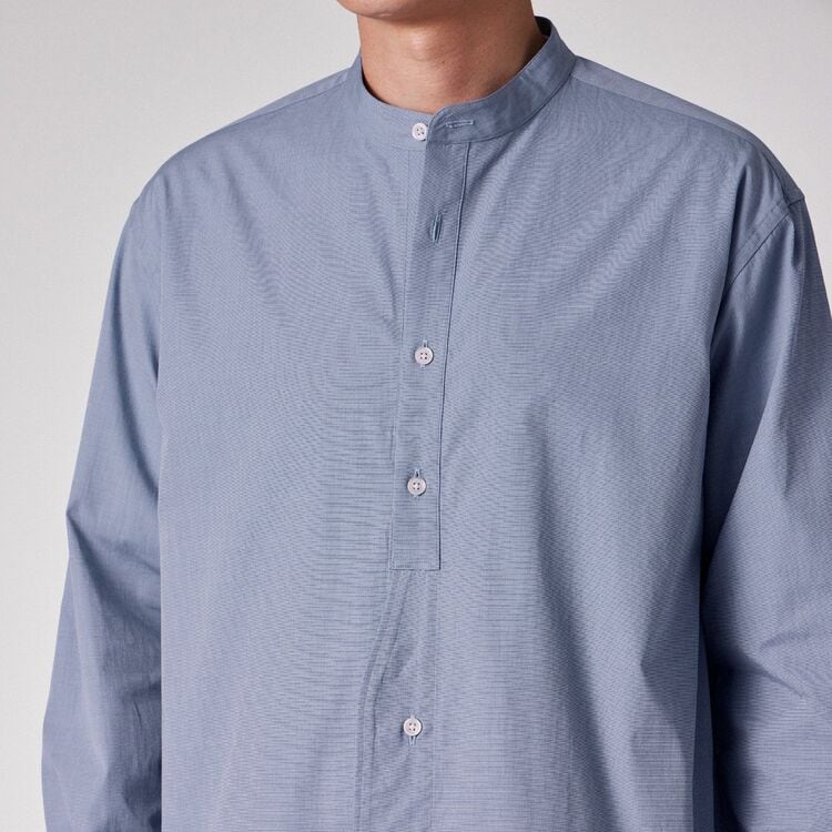 モデル【SAMBRE/サンブル】は、首元をすっきりと見せるバンドカラーシャツです。最大の特徴は、フロントの打ち合わせ部分(前立て)にクラシックなドレスシャツのディテールを踏襲したデザイン。伝統的な要素を取り入れつつ、現代的なシルエットに落とし込むことで、単なるインナーシャツに留まらない存在感を持たせています。
