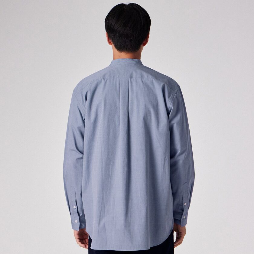 経糸に80/2、緯糸に100/2という異なる番手の糸を使用し、さらに3色の色糸を織り交ぜることで無地を表現した、非常に凝ったシャンブレー素材です。それぞれ異なる色糸が重なり合うことで、単純な後染め(製品染め)では決して出せない、陰影と奥行きに富んだ深みのある表情を生み出しています。