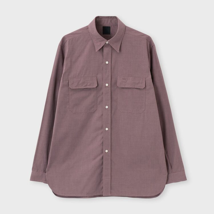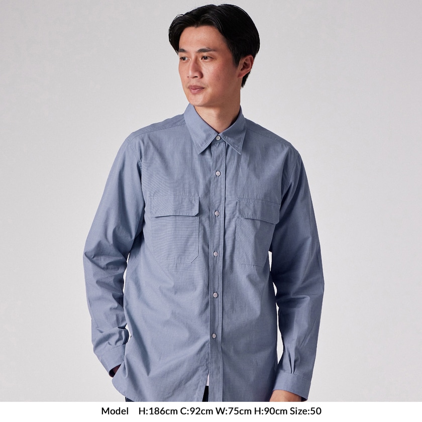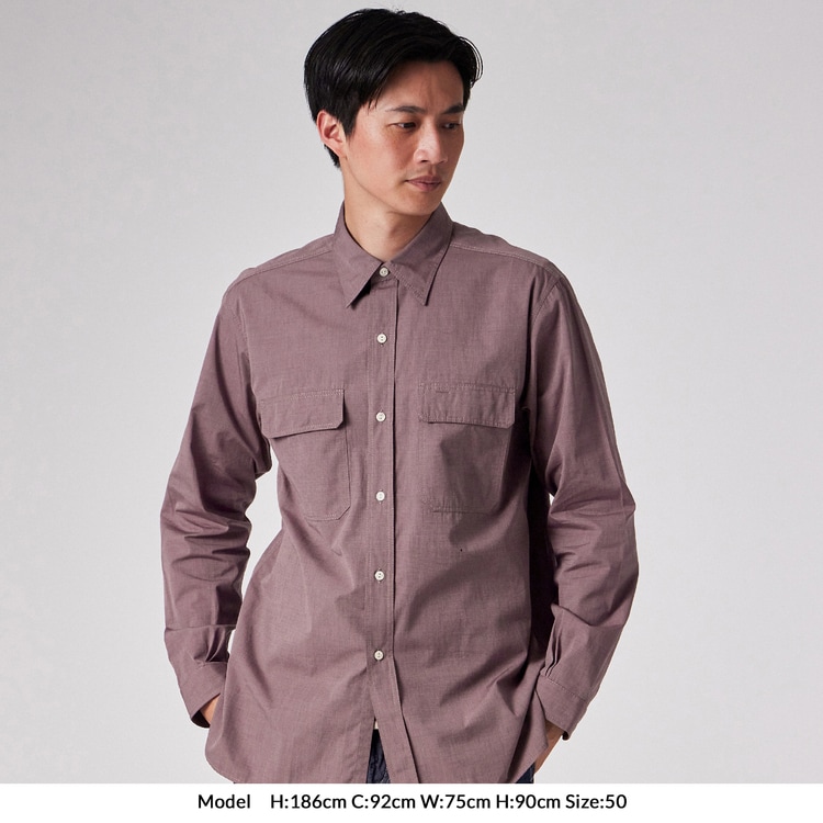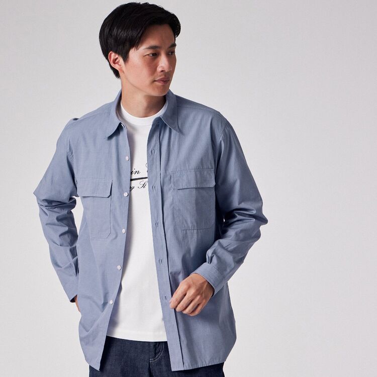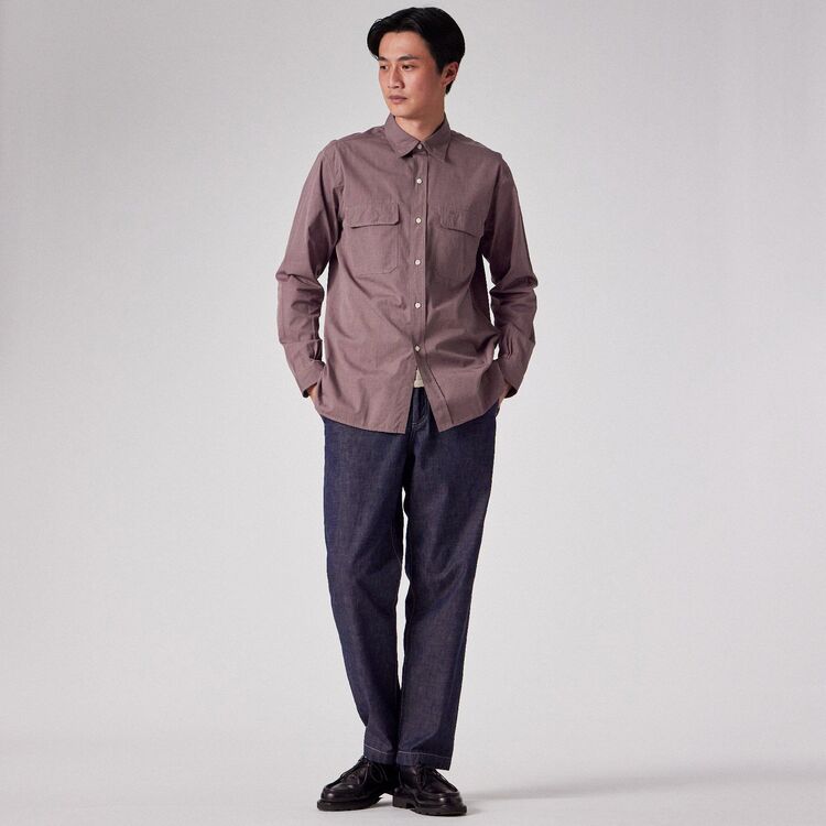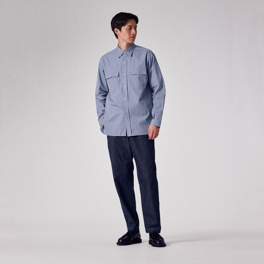 一枚で着ても様になる存在感があり、ワークシャツ特有の土臭さがないため、スラックスなどのきれいめなパンツとも好相性です。フロントを開けてTシャツの上に羽織る「シャツアウター」としても使いやすく、大人の上品なカジュアルスタイルに欠かせない一着です。
