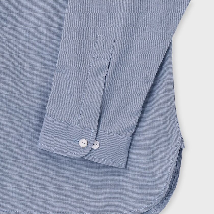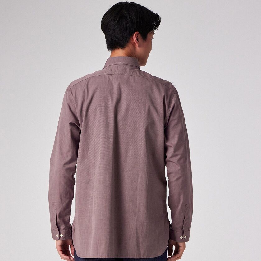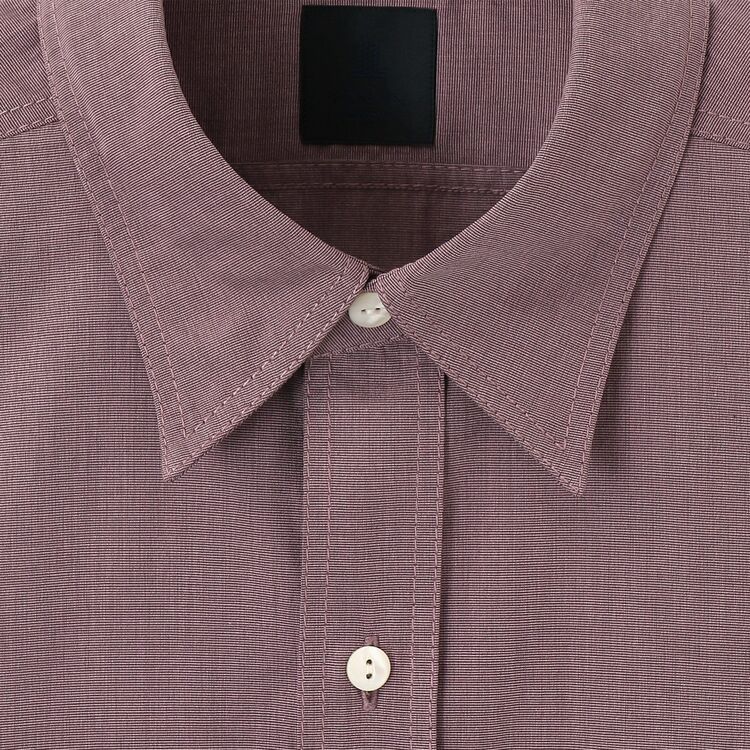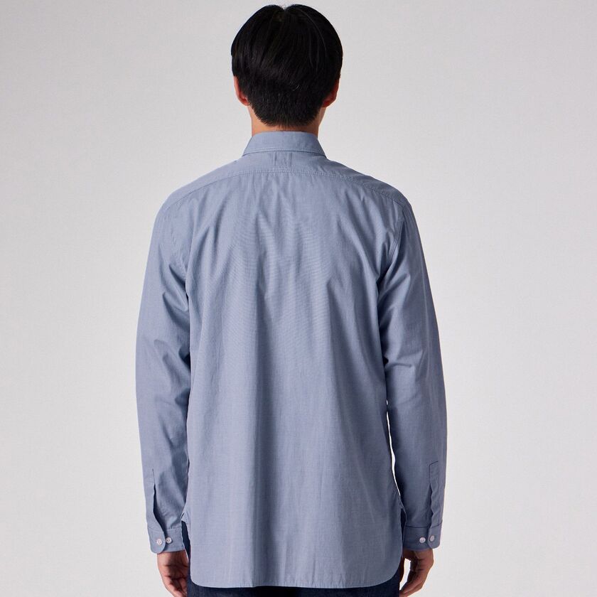 経糸に80/2、緯糸に100/2という異なる番手の糸を使用し、さらに3色の色糸を織り交ぜて無地を表現したこだわりのシャンブレー素材です。糸の太さの違いが生地にふくらみと立体感を与え、滑らかさと豊かな表情を両立。単純な後染めでは表現できない、深みのある陰影と奥行きが魅力です。