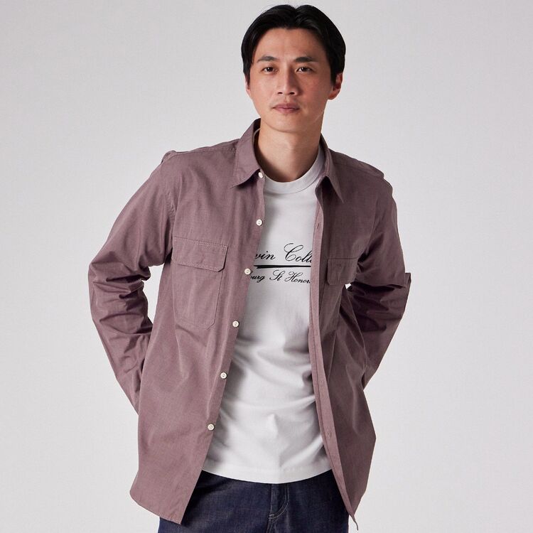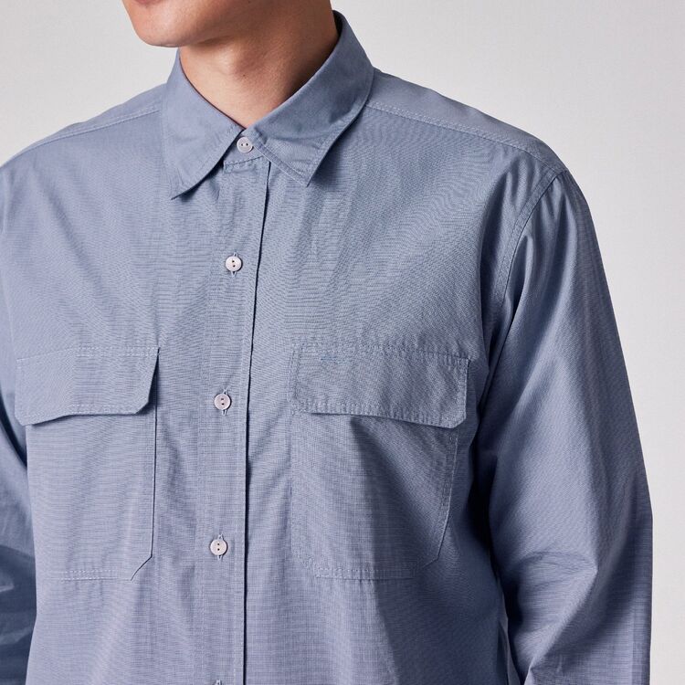 経糸と緯糸の太さを変えることで生まれる微細な凹凸により、肌への張り付きを抑えた快適な着心地です。また、フラップボタンを無くしたことでポケット周りがすっきりとし、見た目の重さを軽減する視覚的な機能美も備えています。滑らかな肌触りと適度なふくらみが、リラックスした着用感を提供します。