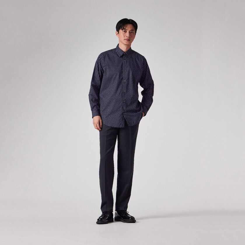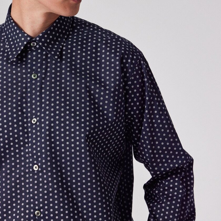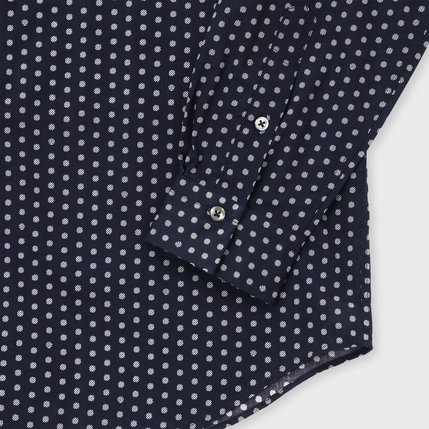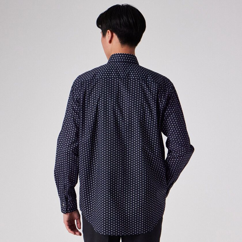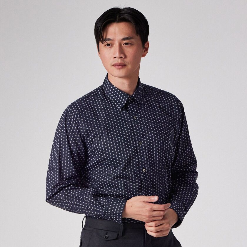 人気のドット柄の中にブランドの象徴である「WJLマーク」をさりげなく忍ばせた、遊び心あふれるオリジナルプリントシャツです。ベースは合わせやすいネイビーに白のドットという王道のカラーコンビネーションを採用。モデル【AIN/アン】の特徴であるレギュラーカラーに加え、胸ポケットを排し、前立てを内側に折り込むフレンチフロント仕様にすることで、美しいドットパターンの表現を邪魔しない、クリーンで洗練されたルックスに仕上げています。