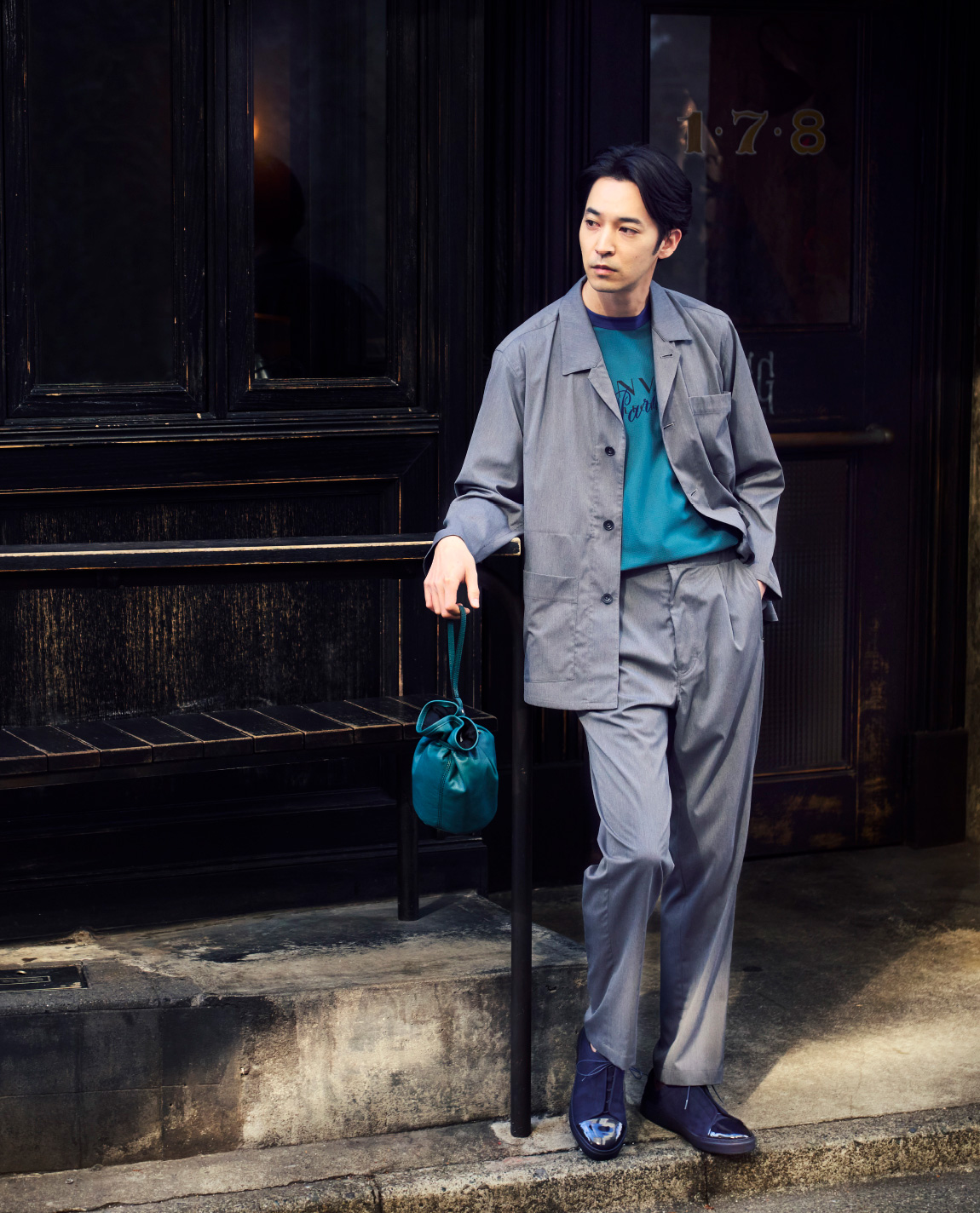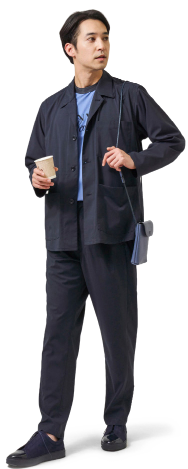 くつろぎを感じさせながらもルーズさとは無縁でありたいのが大人のオフのスタイル。抜群のストレッチ性を備えたセットアップが最適です。