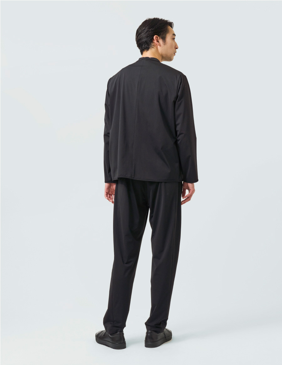 ヨコだけでなくタテにも伸びる2WAYストレッチの生地は着用感も快適で、防シワ性や家庭洗濯が可能なイージーケア性も備えています。羽織りのように軽やかながら型崩れしにくいのも特徴です。