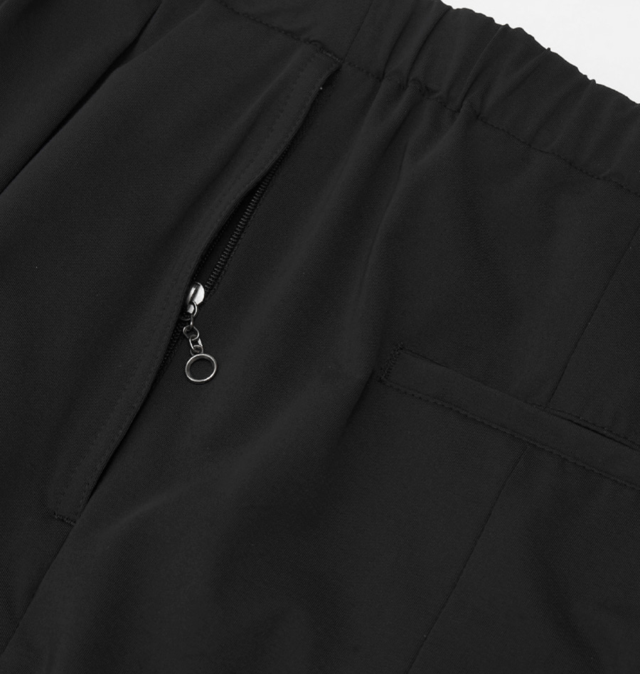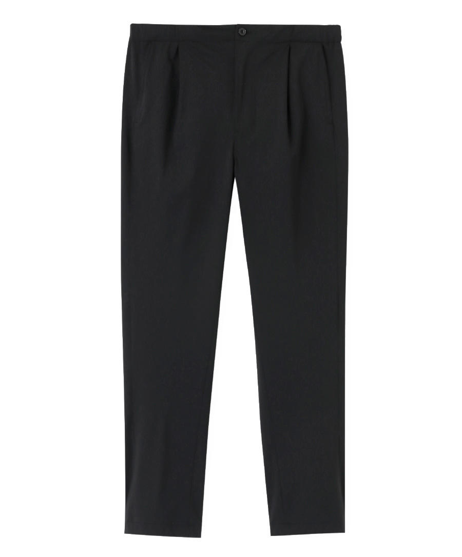 ウエストのドローストリング&ゴムシャーリングがもたらす締め付けのない心地よさ。それでいてポケットなどは大人の品を感じさせるデザインワークで、美しいテーパードシルエットと共にコンフォートとエレガントがバランスよく同居しています。