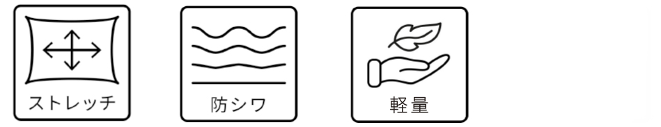 ポリエステルをベースとした合繊でも、それを感じさせないトロピカルウールを思わせるシルキーな表情。エレガントなドレープを持つドレス感あふれる生地は、吸水速乾性、ストレッチ性、UVカット、接触冷感、家庭洗濯が可能と多機能なことも特徴です。もちろん着心地も抜群に軽やかです。