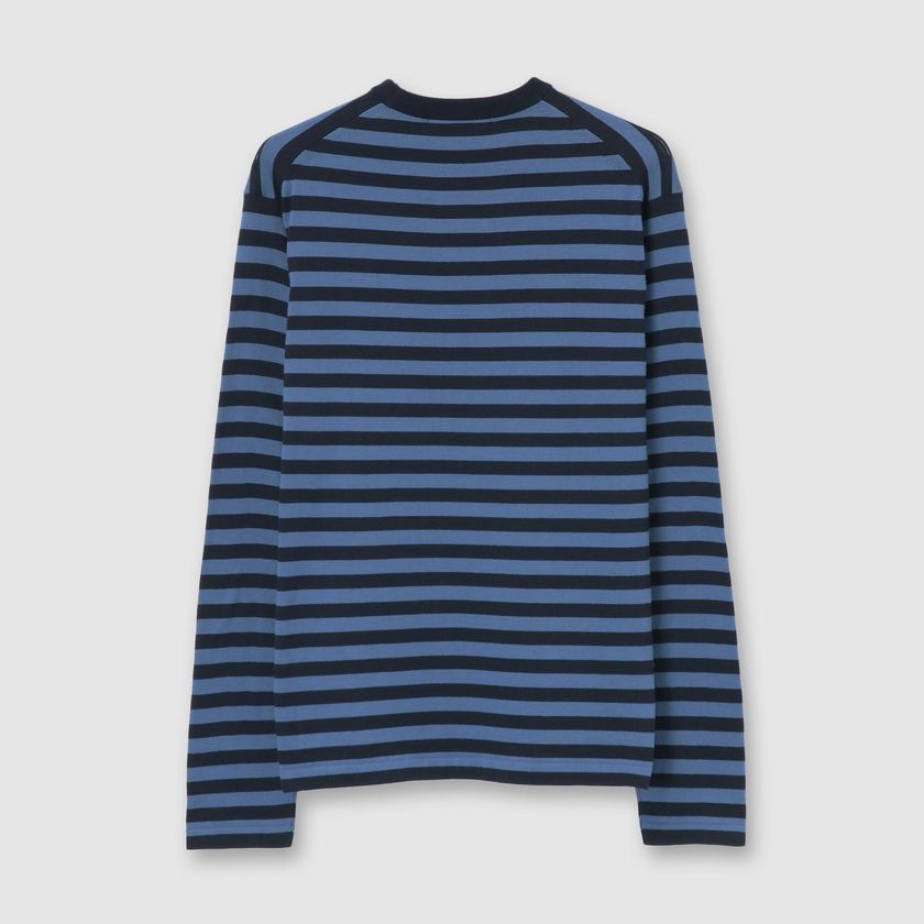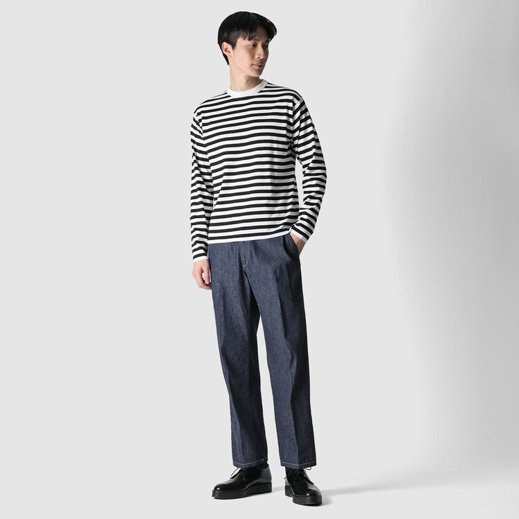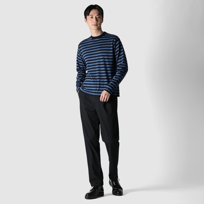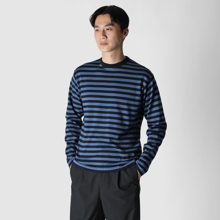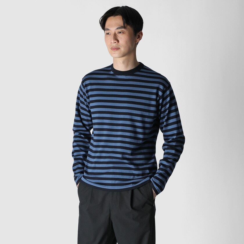 滑らかな光沢、しなやかさ、丈夫さが特長のGIZA87コットンを用いたベーシックな長袖クルーネックセーターを、フレンチ